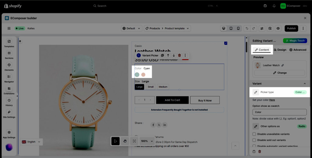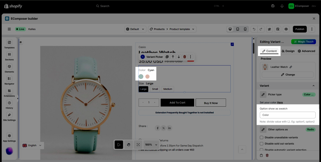 - One more step to display the color swatch is to change the Variant picker type to Color picker.