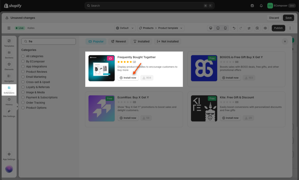 On the Extension pop-up, you can see the Frequently Bought Together extension. Click Install now to install it to your Extensions.
