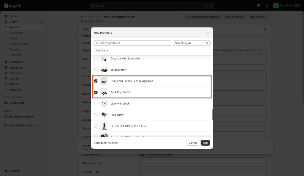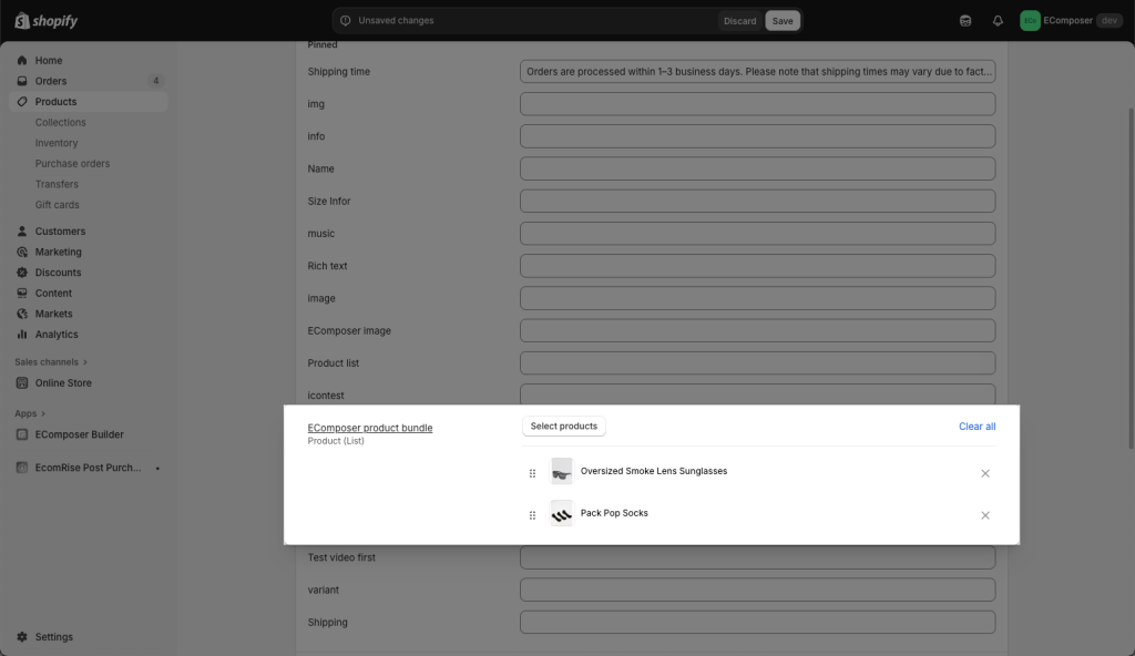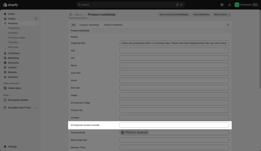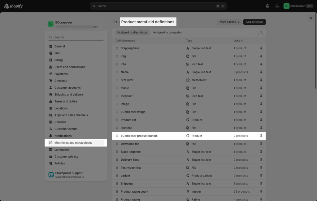 After installing the extension, the “EComposer product bundle” metafield will be added to Shopify. Please go to Shopify Settings -> Metafields and metaobjects -> Products to check if the Metafiled is there or not: