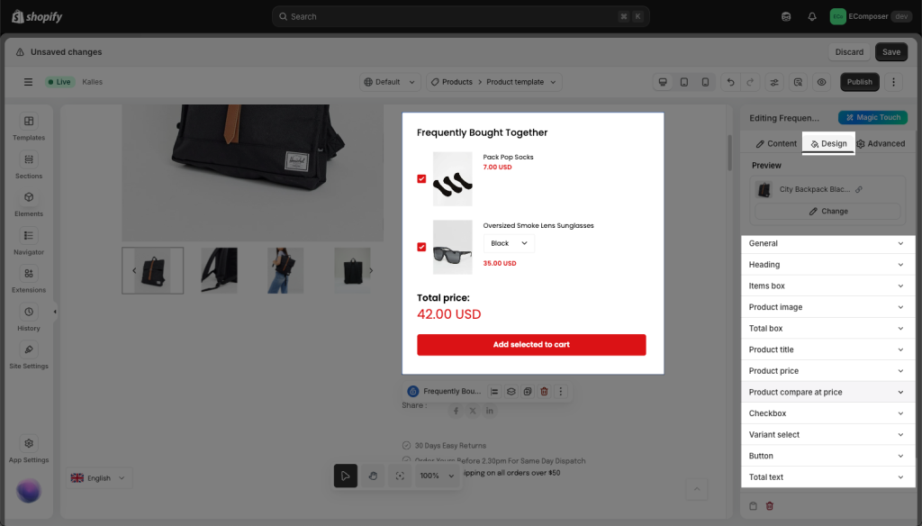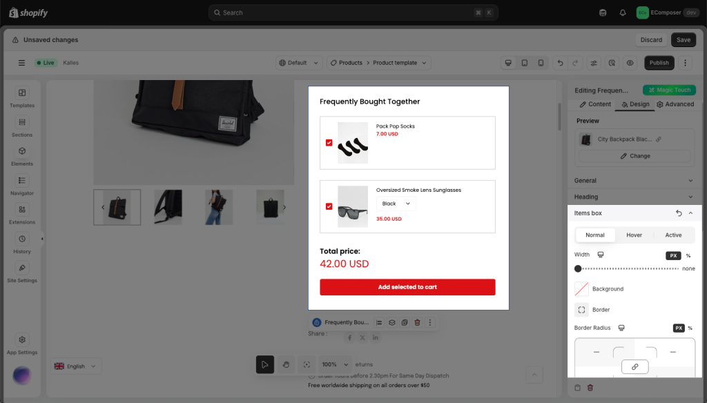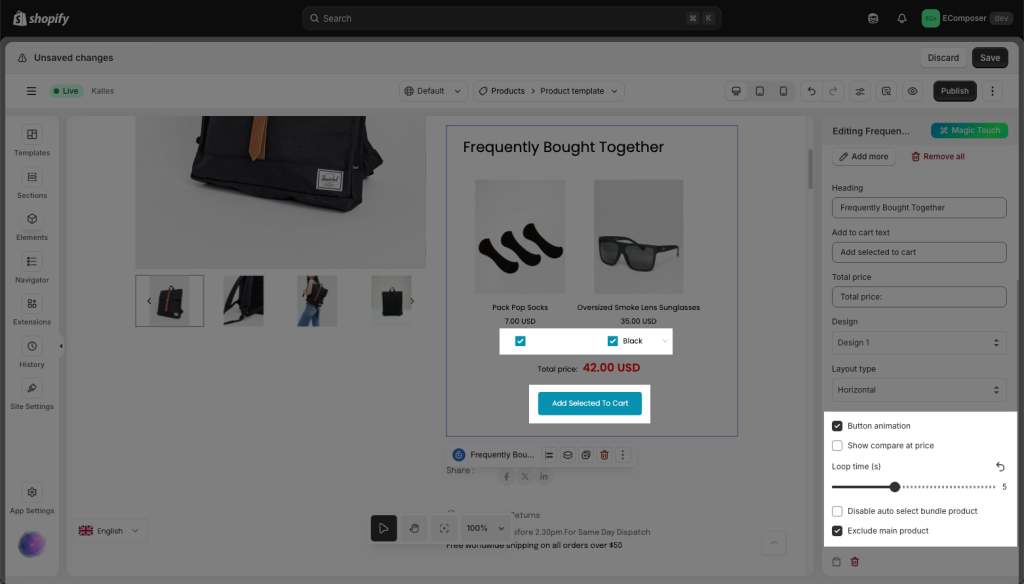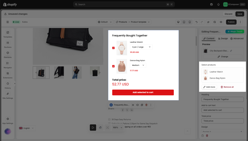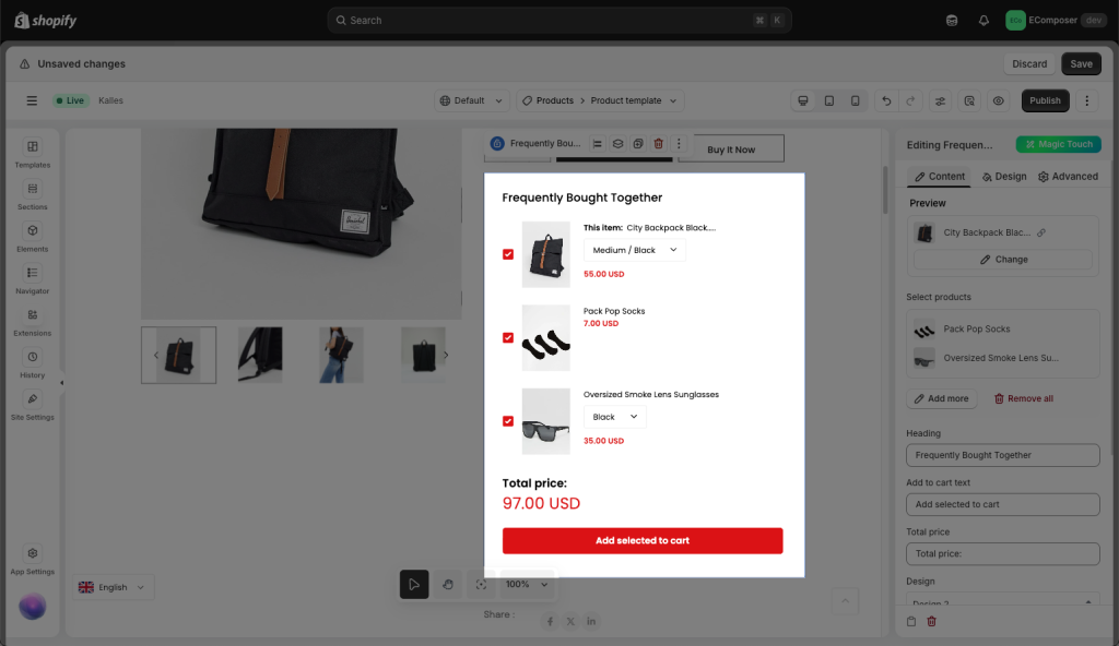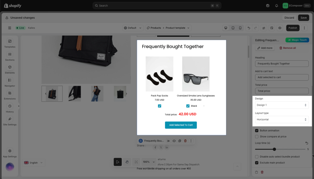For example, the main product on your product page is a Backpack, so you can add Socks or Sunglasses to buy together. They are also products that are similar to a selected product.