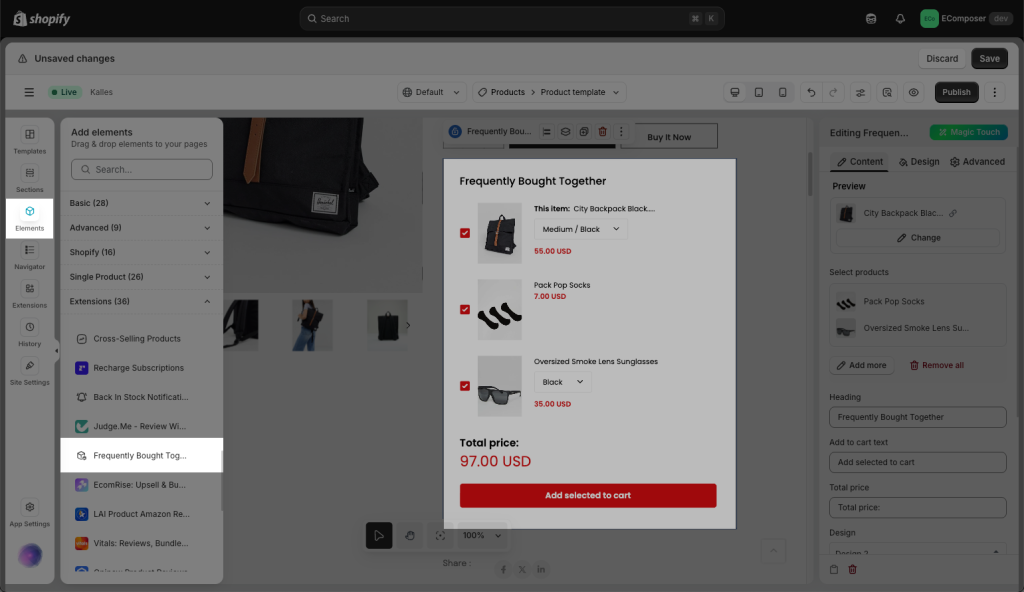 As a result, when you drag and drop this element onto a Product template of the main product, the chosen products appear immediately.