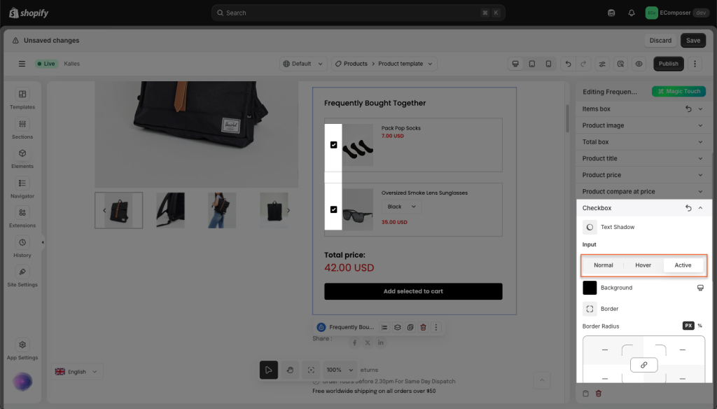 - Checkbox: This is the checkbox beside the variant selected, the settings are covered here. For example, you can change from a square checkbox to a circle checkbox.