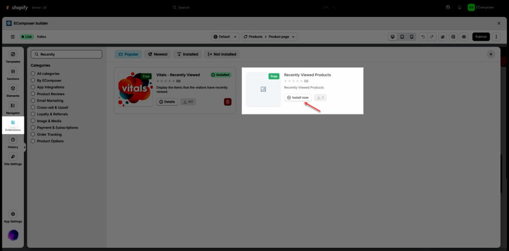 On the Extension pop-up, you can see the Frequently Bought Together extension. Click Install now to install it to your Extensions.