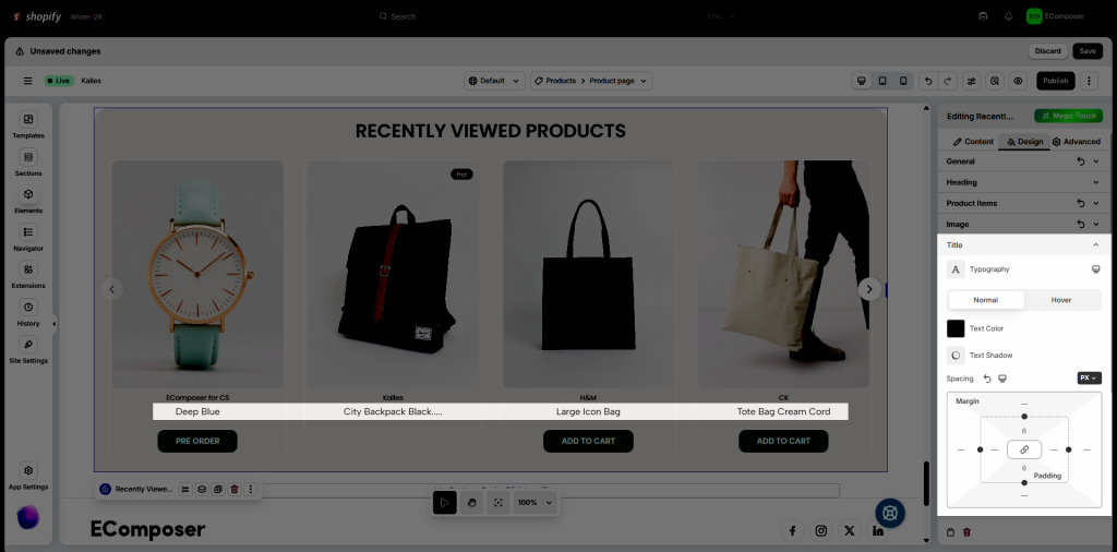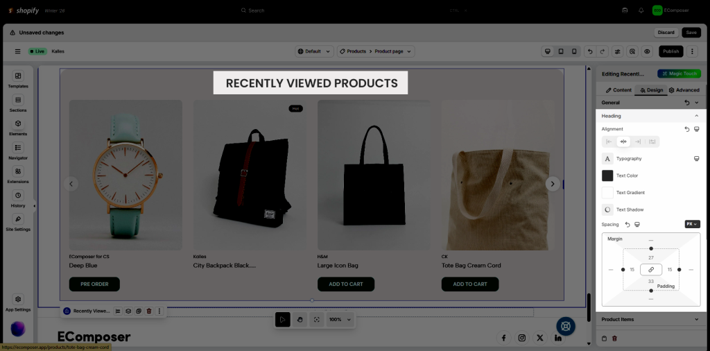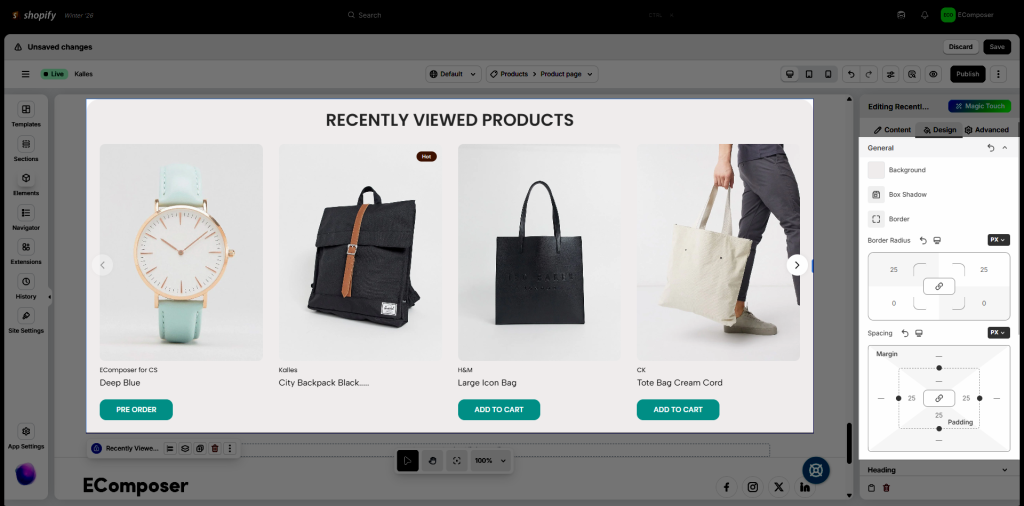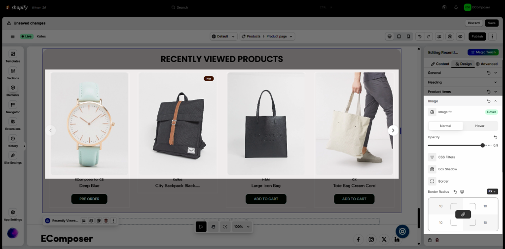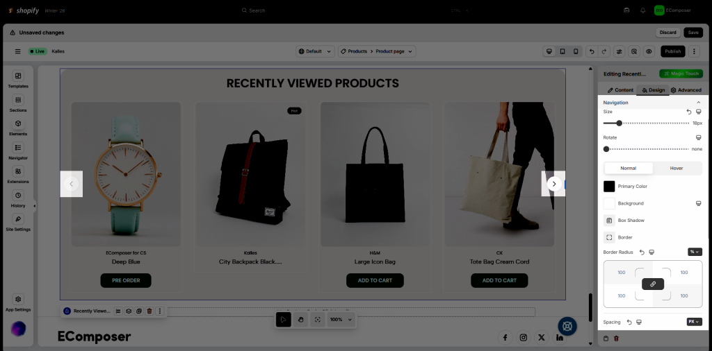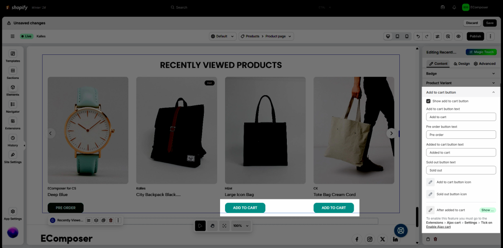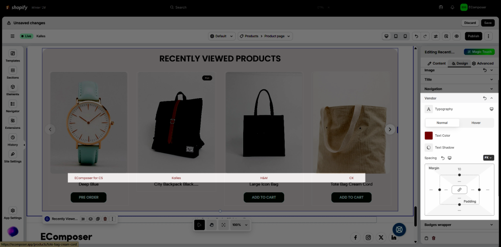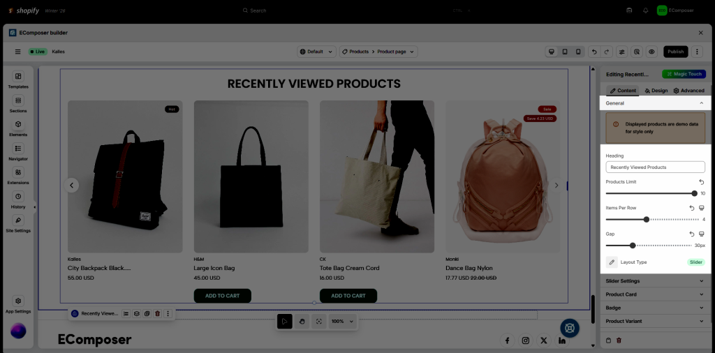 Note: Displayed products in the editor are demo data for style only.