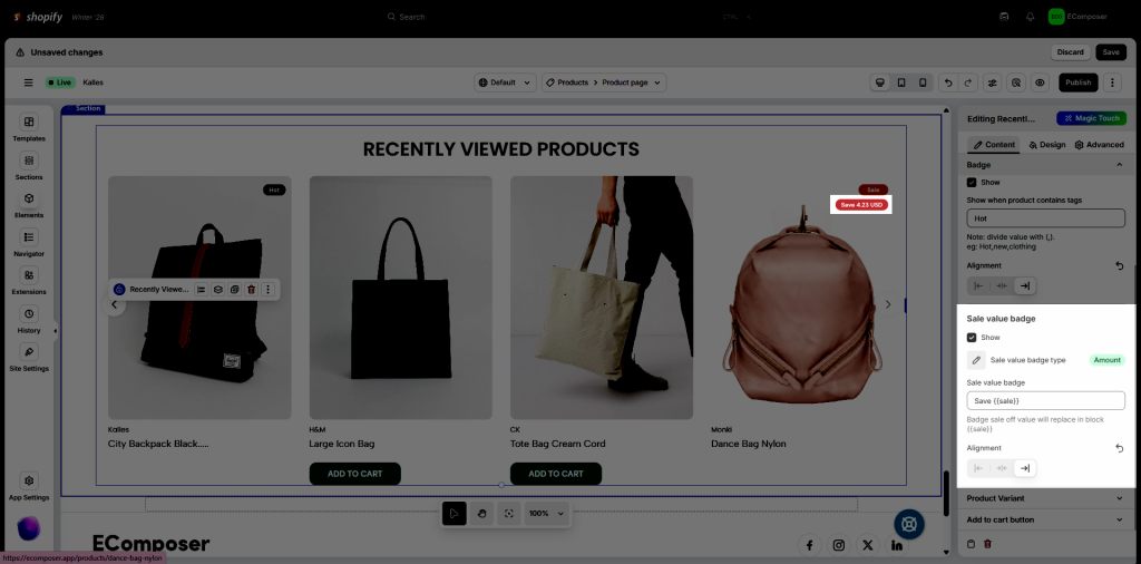 - Alignment: Align the badge based on each product container on the left, center, or right.
