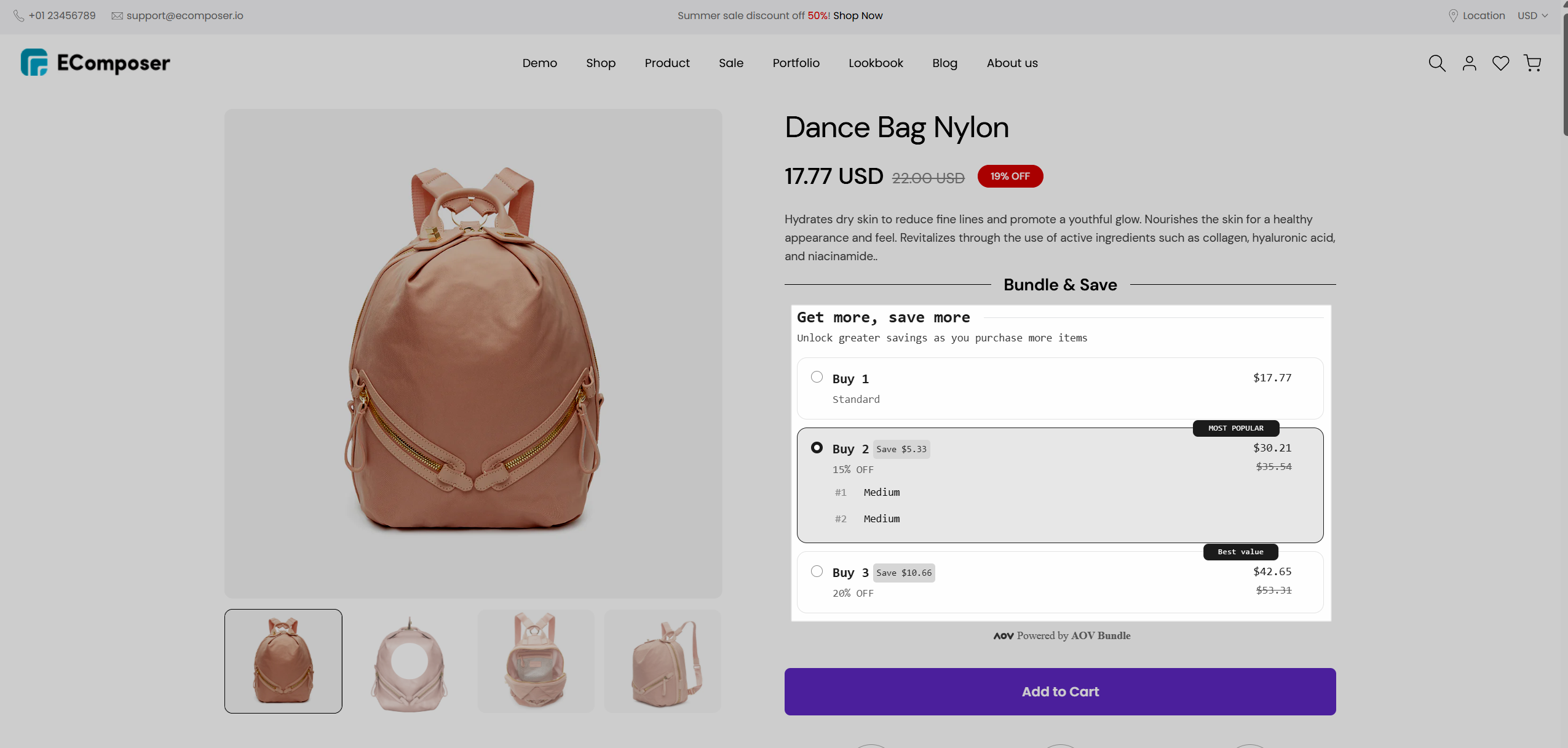 AOV.ai Bundles Upsell is designed to help you increase your average order value by offering product bundles, upsell, and cross-sell deals directly on your storefront. The integration in EComposer allows you to easily add and display these bundle offers on any page built with EComposer, making it simple to create high-converting layouts and promote additional products without needing extra coding.