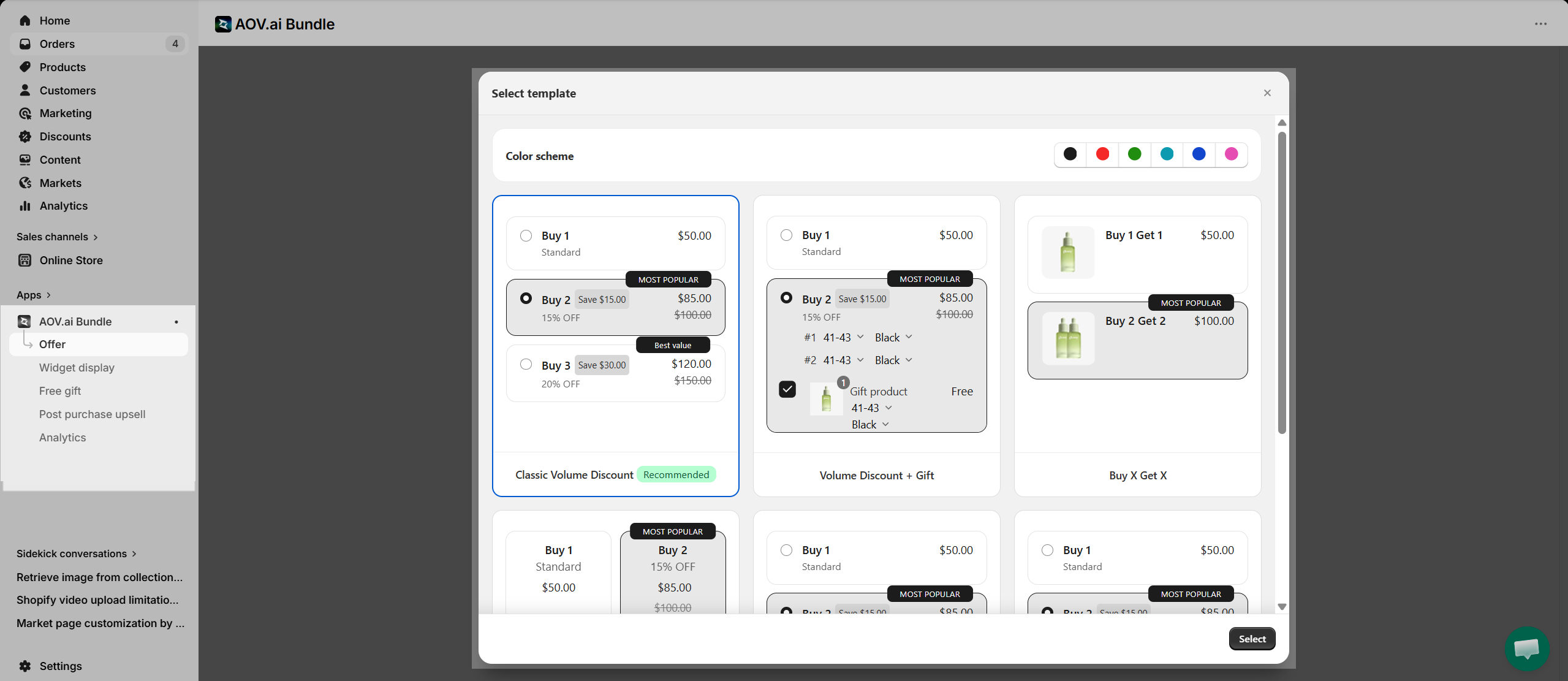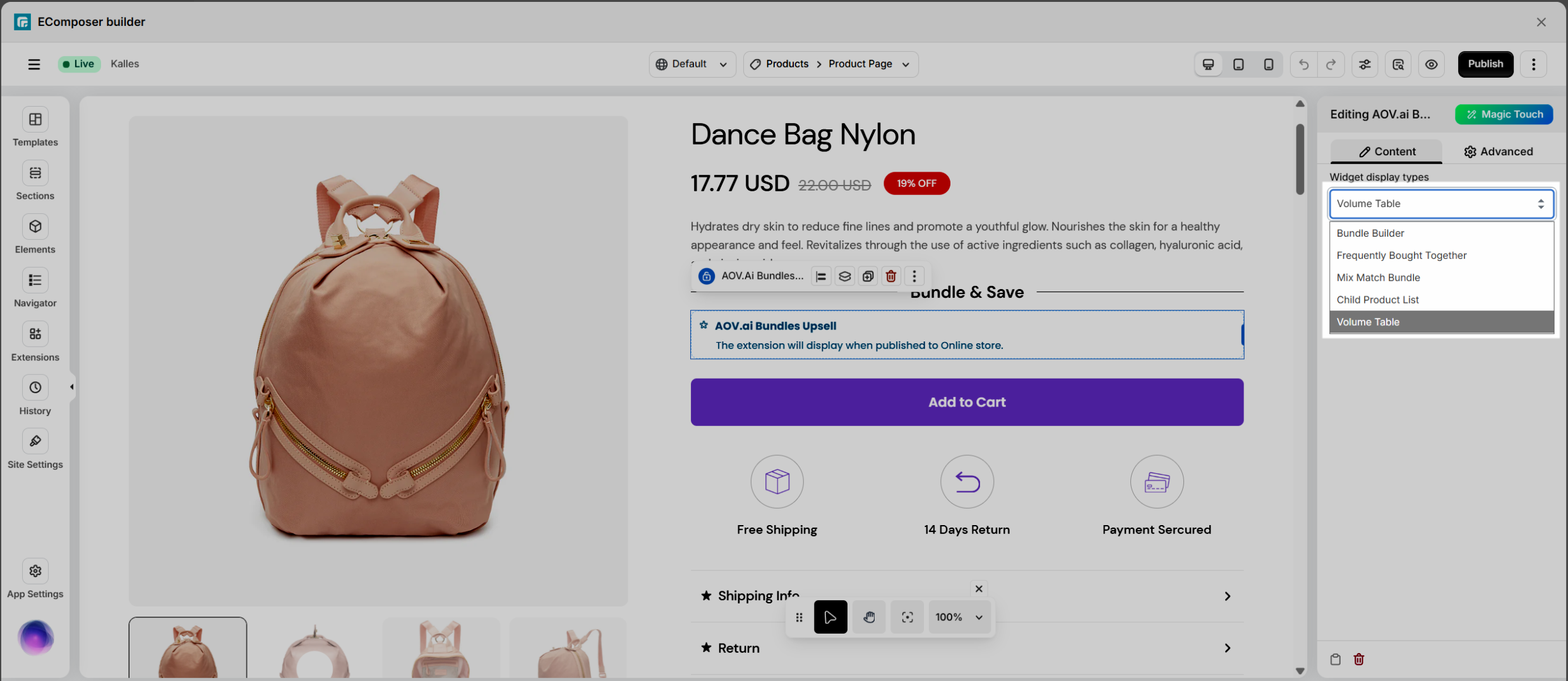 Notice: Make sure the bundle type you create in the AOV.ai app matches the widget type you select in the EComposer extension. Otherwise, the bundle will not display correctly on your page.