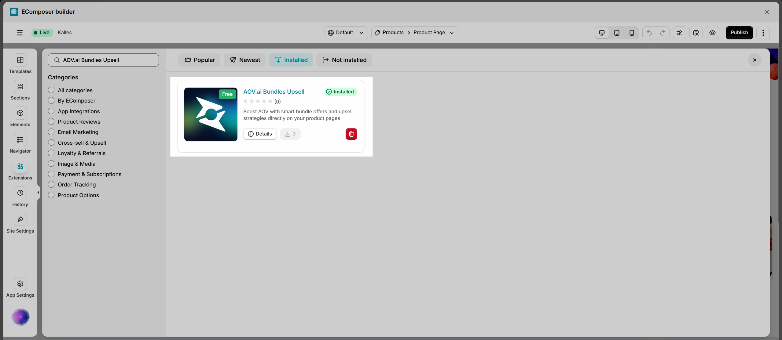 After creating your product page template in the EComposer app, you can proceed to add the AOV.ai Bundles Upsell extension. This allows you to display bundle offers directly on your product pages and optimize your upsell strategy.