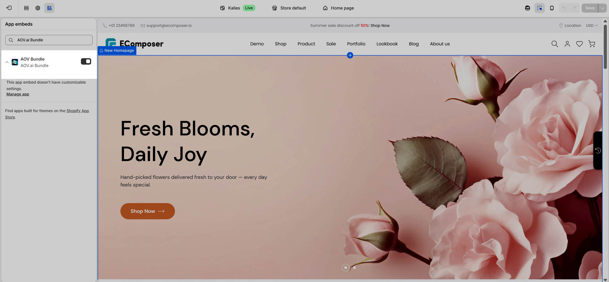 Make sure to enable the App Embed of AOV.ai Bundles Upsell in Online Store → Themes → Edit theme → App embeds, then toggle on AOV Bundle.