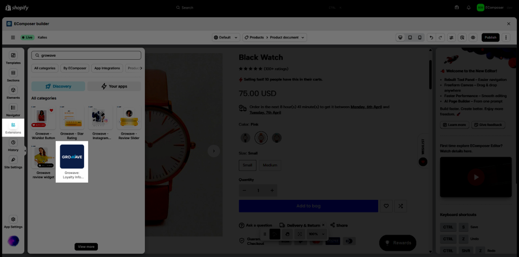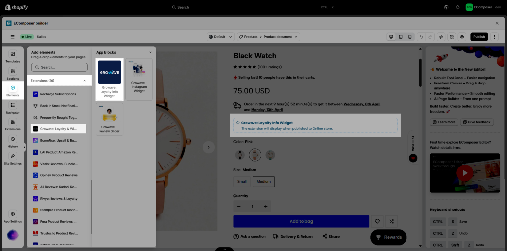 Step 2: Back to the EComposer editor and drag and drop the extension into the desired spot. Open Elements -> Extensions -> Find Growave: Loyalty Info Widget extension, drag & drop it to your page.