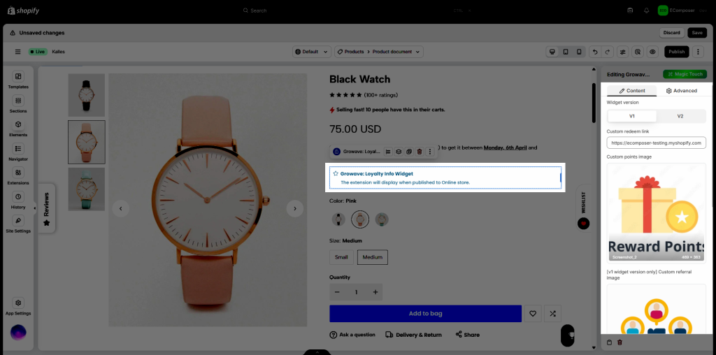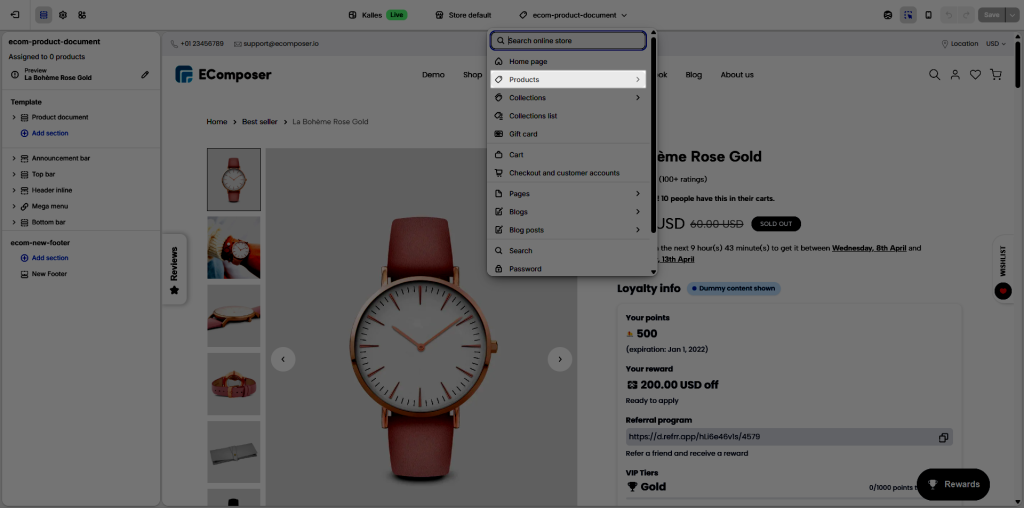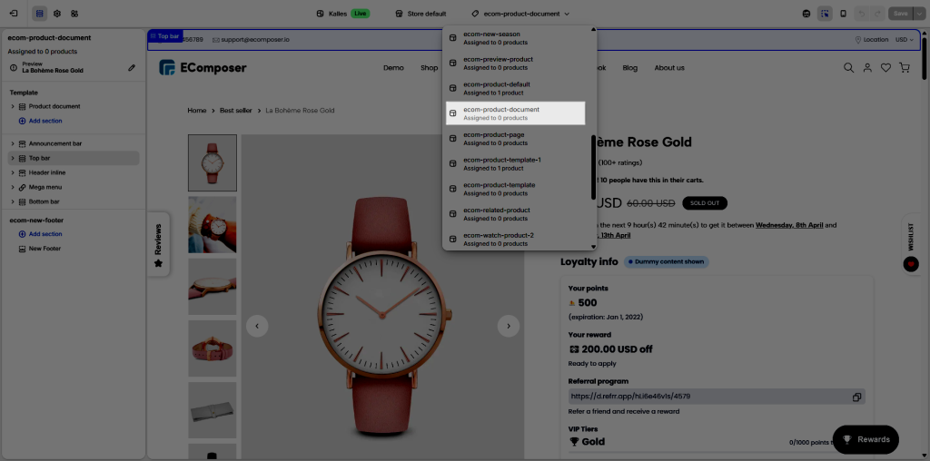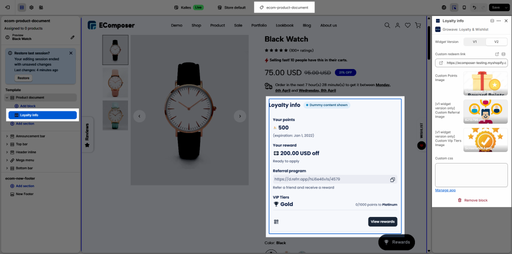Step 4: For more settings, you can access the EComposer’s template from the Theme’s editor and edit the Growave – Loyal Widget block.