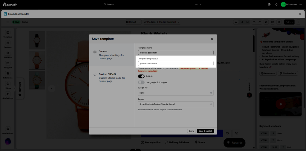 To access the EComposer’s template from the Theme’s editor, you need to go to Products -> ecom-template-slug