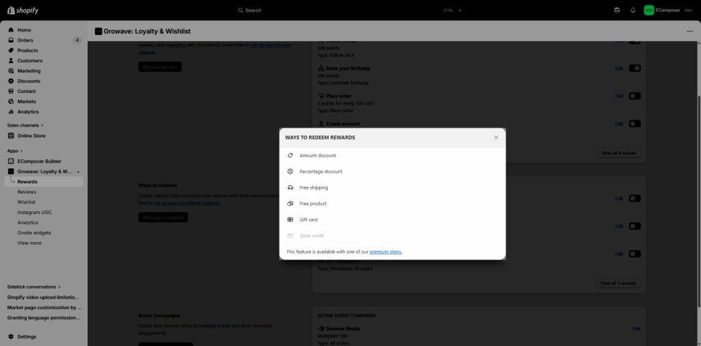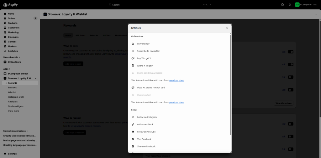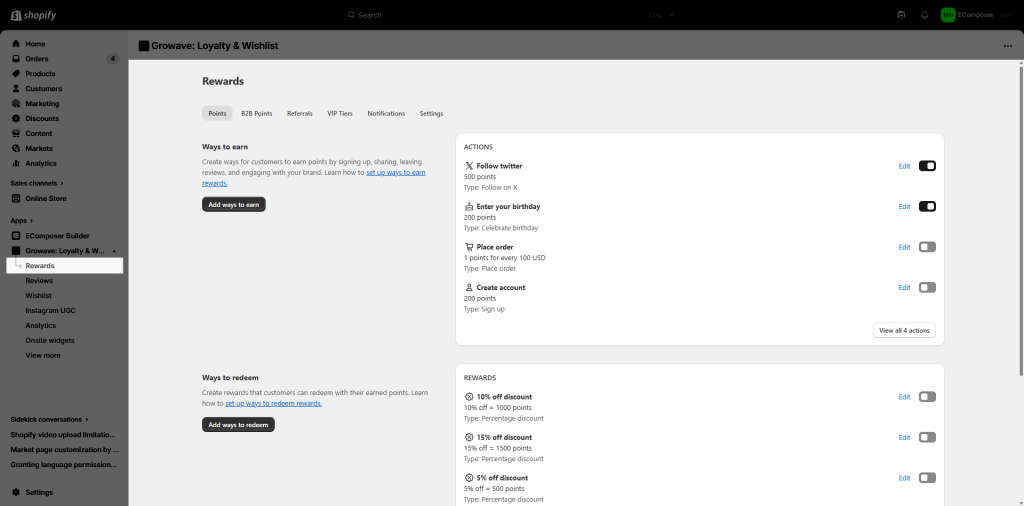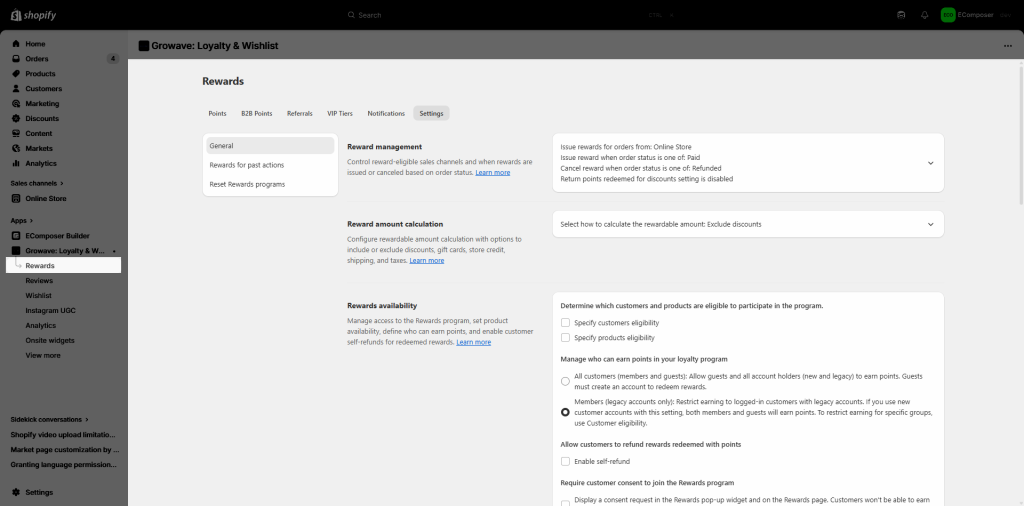 Step 1: Go to the Shopify admin, open the Growave app, and configure the Rewards first.