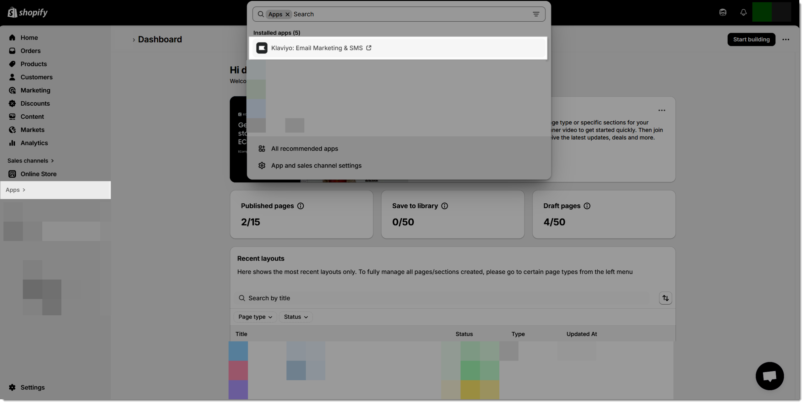 After installing the app, go to your Shopify Dashboard → Apps → Klaviyo Email Marketing & SMS.