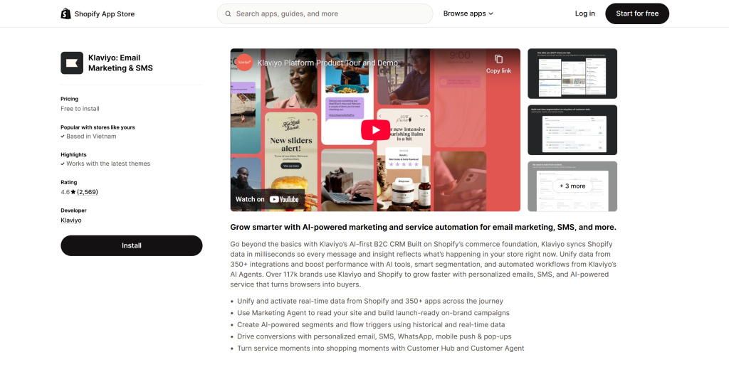 The Klaviyo Email Marketing & SMS app provides a powerful suite of tools to help you create, automate, and personalize both email and SMS campaigns. With customizable templates and an intuitive editor, merchants can easily design visually engaging emails. Advanced segmentation features also allow you to target the right customer groups based on behavior, preferences, and purchase history.