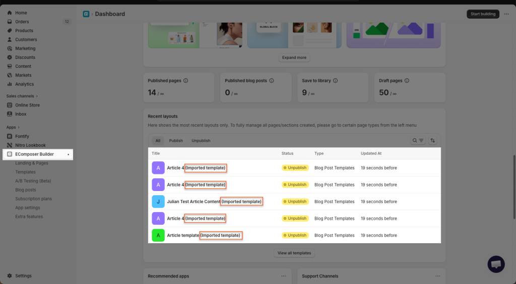 Result: After importing, go to the EComposer app dashboard to check your page or template list. All imported templates and pages will retain their original names from the source store, with an additional label Imported template displayed next to the name and their status set to Unpublish. You can open them in the editor to update the page name if needed, adjust the design, and then publish them as normal.