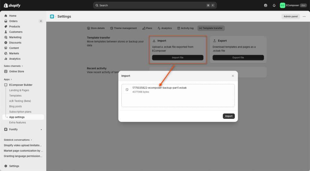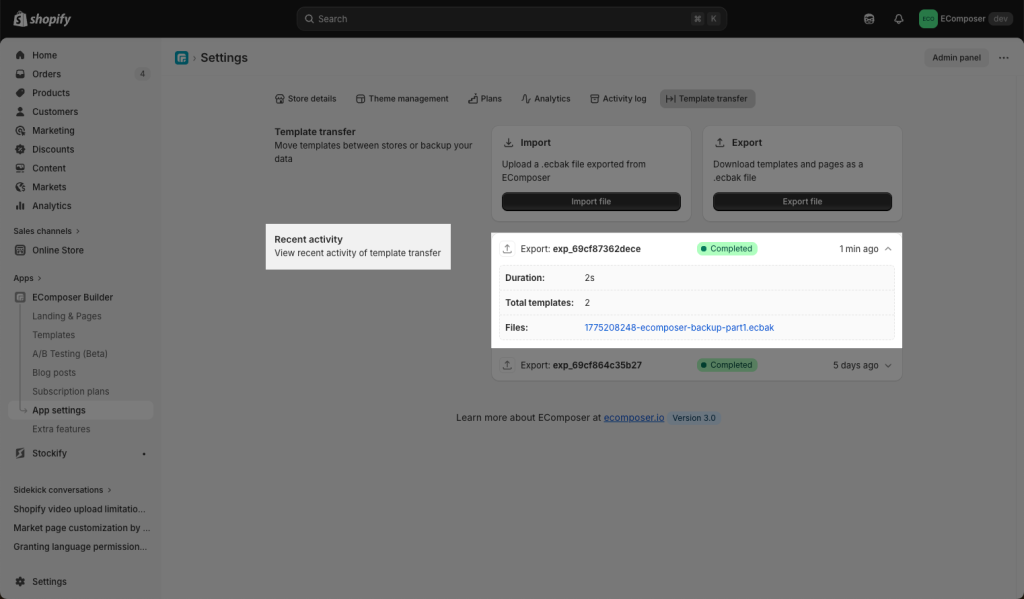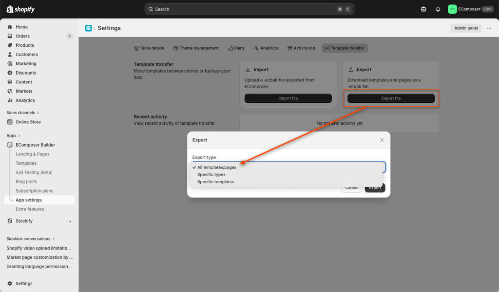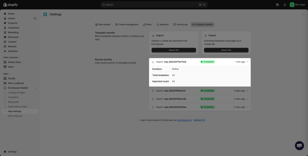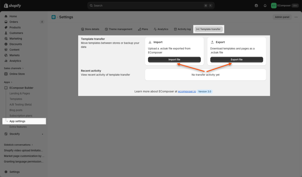 To open this feature, you can go to the EComposer App Dashboard -> App settings -> Template transfer.