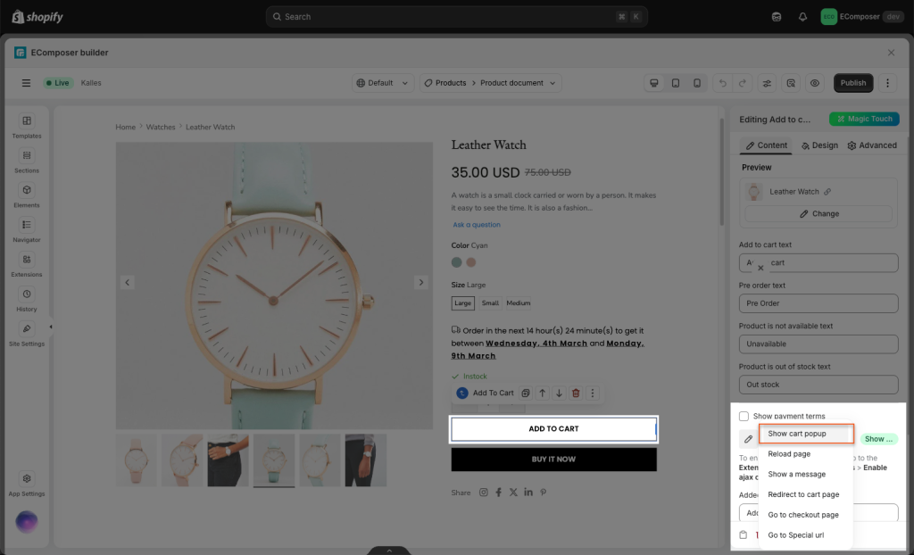 Note: You can only do this when your theme has the cart drawer function and when the pages in EComposer have Shopify Header enabled.