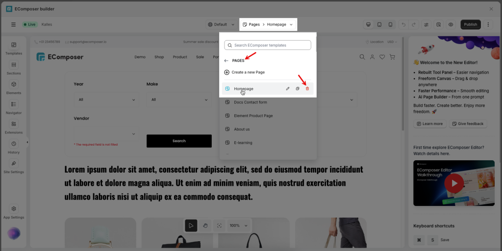 Creating a page with the wrong page type is a problem usually committed by EComposer users. For example, you created the Homepage under the Standard page by mistake. So you might want to switch from the Standard page to the Homepage instead of recreating the page from scratch. Please follow the steps below.