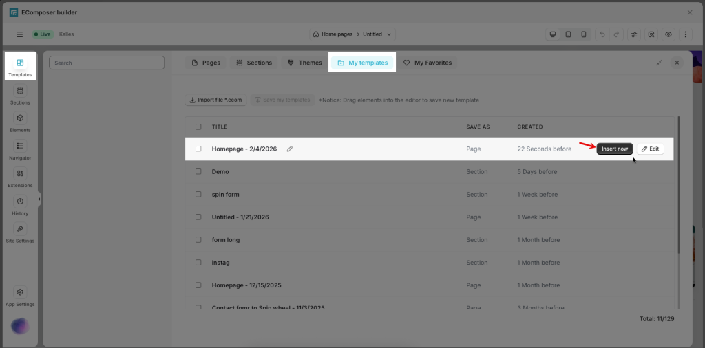 Step 3: Open the Templates -> My Templates -> Find the saved template, click Insert now to insert it into your new page.