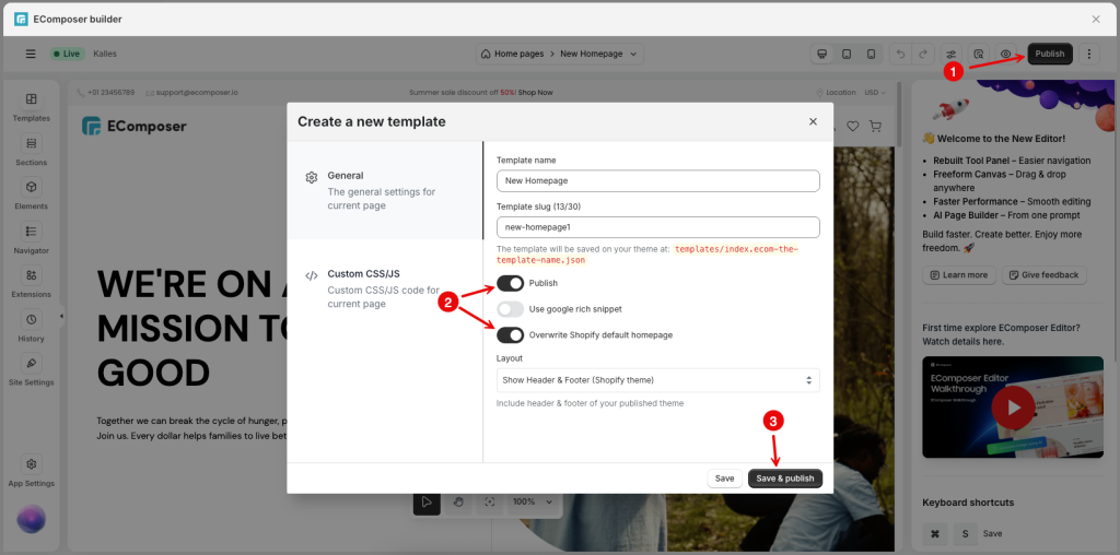 Step 4: Finally, please click Publish and turn on the Publish and Overwrite Shopify default homepage options to publish your page and make it as a homepage.