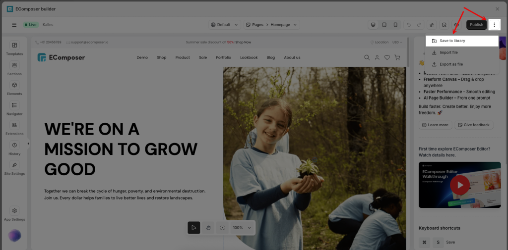 Step 1: Save your page as a template to the library by clicking Settings -> Save to Library.