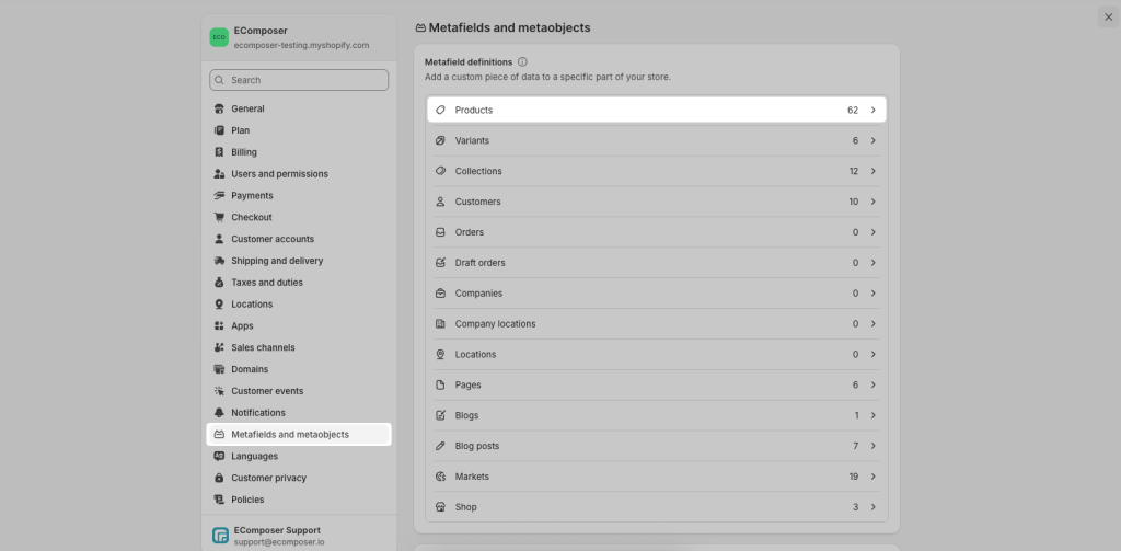 If you rely solely on EComposer to insert product-specific images and text into a single template, the content will remain identical for all products. Creating multiple product templates to accommodate unique content can quickly exceed your plan’s page number limit. Metafields provide an efficient solution to this challenge.