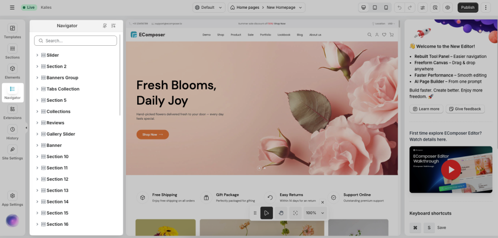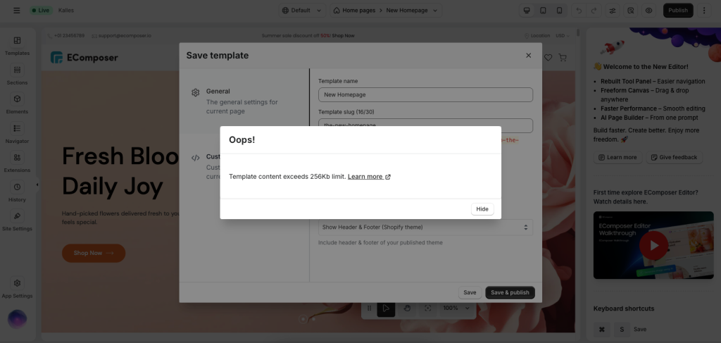 While EComposer is super flexible, we still need to abide by Shopify’s rules regarding themes and templates to make sure they do not affect your site’s performance. One of those requirements is that template files in themes are less than 256KB in size. When building a page, you might exceed that limit in a few ways. But in general, it is probably because there are too many elements on the page, or you are using big chunks of code in custom code blocks.