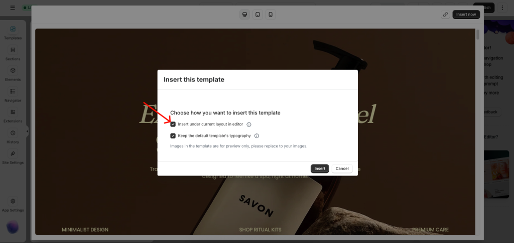 For example, on the above page, I have more than 15 sections. To solve the issue, you can try to check and delete the sections if you see that they are duplicated. When you insert a template into your page, you might tick the Insert under current layout in the editor option (see the image below). If you tick that option, the sections in the new template will be inserted below the existing sections on your page. So the number of sections can increase a lot without you knowing.