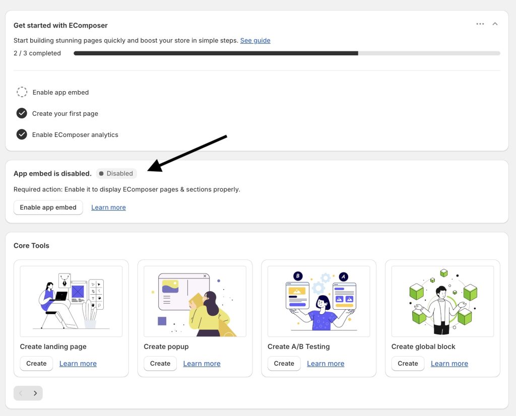 If your EComposer pages or sections are not showing on the storefront, the most common reason is that the EComposer app embed is disabled. App embeds are required for EComposer to load and display content correctly on your theme.