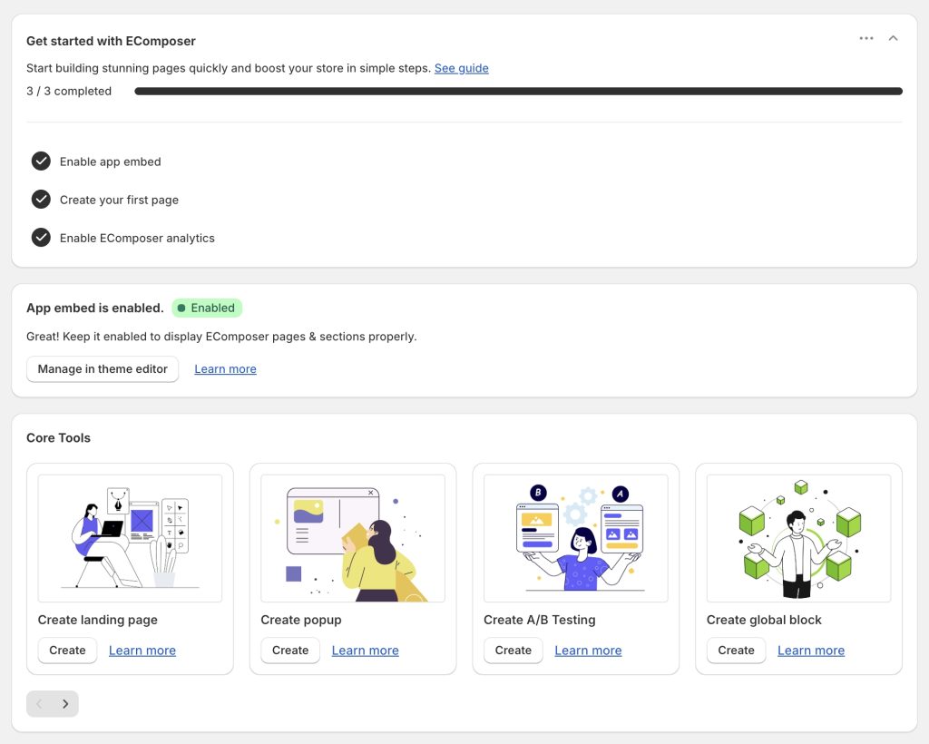 3. Back to EComposer, reload the app dashboard and see if the status App Embed is enabled now.