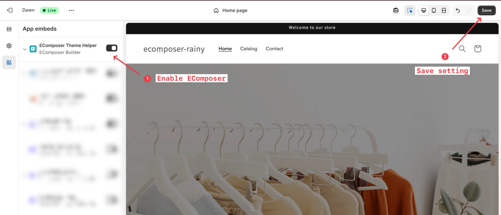 2. It will then direct you to your theme editor page. Here, the EComposer App Embed (or EComposer Theme Helper) is auto-toggled on. All you need to do is “Save” the setting.